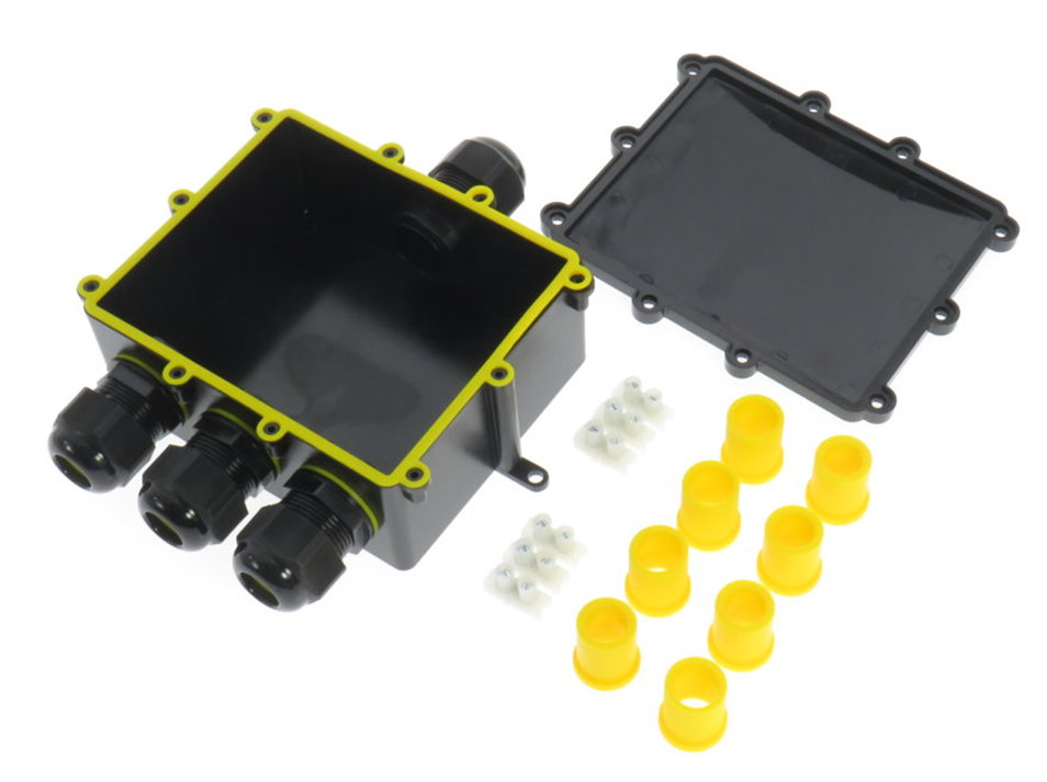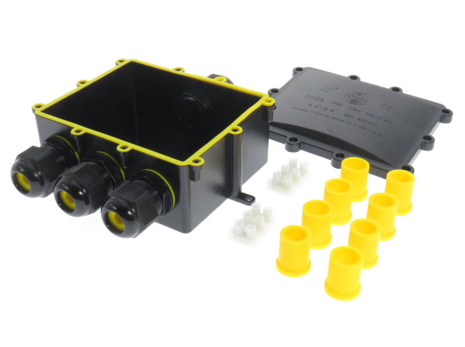 Verteilerdose der Schutzklasse IP68 mit 4 Ein- Ausgängen in wasserdichter Ausführung. Die Ein- und Ausgänge haben hochwertige Verschraubungen mit gelben Gummidichtungen für Kabeldurchmesser 4-8 mm, 8-12 mm und 10-14 mm. Sie wird mit 10 Edelstahlschrauben und einer 6 poligen Lüsterklemmenreihe ausgeliefert.