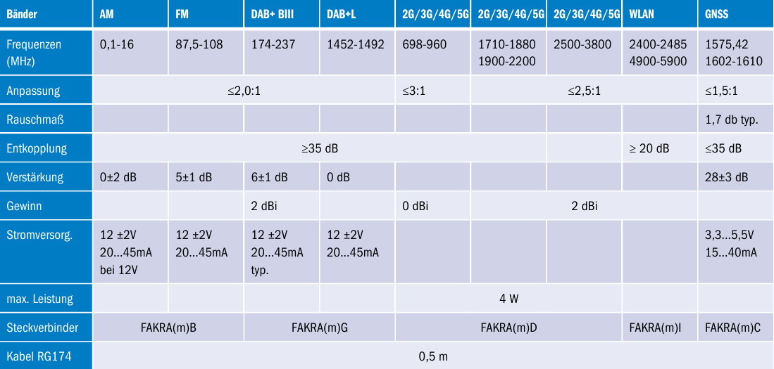 Das ATTB 3799.30 GFK-Dachantennen-Set deckt mehrere Frequenzbänder und damit Kommunikationsdienste ab. Darunter AM, FM, DAB+, GSM (2G), UMTS (3G), LTE (4G), 5G, GNSS und WLAN.