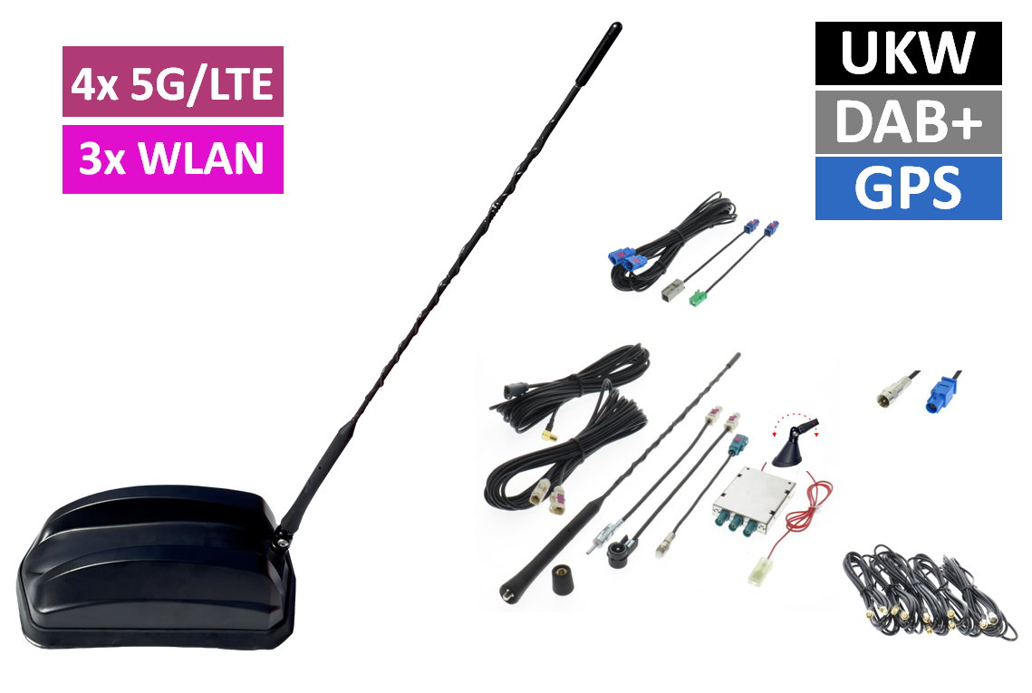 Die Antenne zeichnet sich aus durch 4 Empfangselemente für LTE/5G und WLAN, sowie ein Element für GPS/Glonass und Element für die o.g. Radio UWK/DAB+ Anwendung.