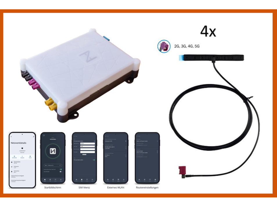 CamperNet Router Pro mit vier Klebe-Innenantennen, speziell für Fahrzeuge bei denen keine Außenantenne installiert werden kann. Die Kabellänge jeder Antenne beträgt 1,5 m. Üblicherweise werden je 2 Antennen (vom schwarzen und lila Anschluss) in ein linkes Fenster und je 2 Antennen (vom schwarzen und lila Anschluss) in ein rechtes Fenster installiert.