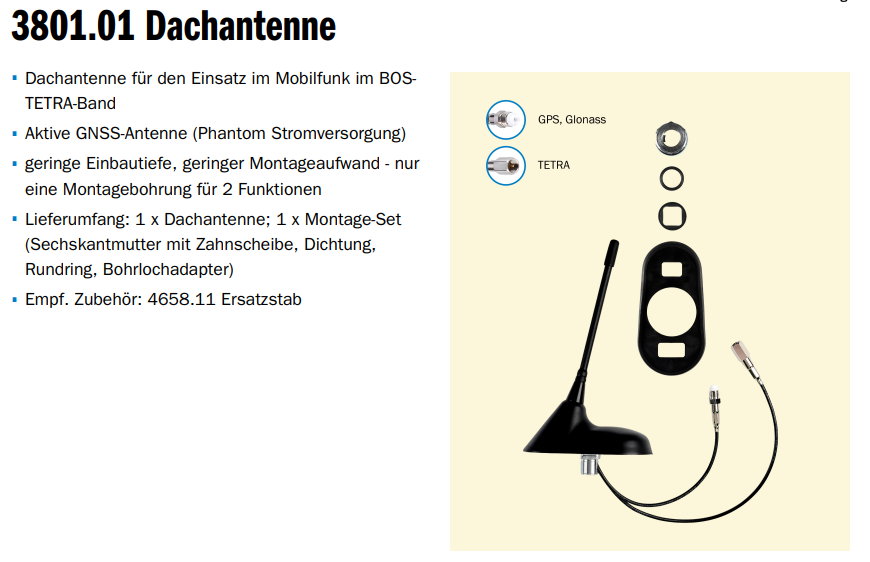 Die ATTB_3801_01 Multifunktionsantenne deckt mehrere Frequenzbänder und damit Kommunikationsdienste ab. Darunter TETRA und GNSS (GPS).