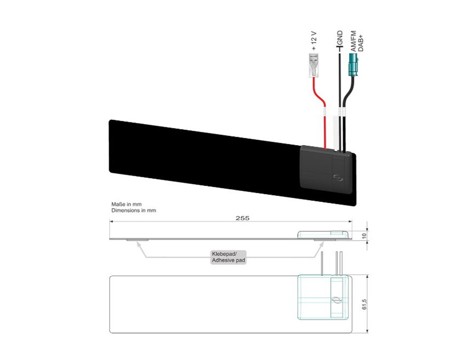 Glasklebe-Innenantenne zur Klebebefestigung an der Frontscheibe (1) oder an Seitenscheibe (2) mit folgenden Eigenschaften: