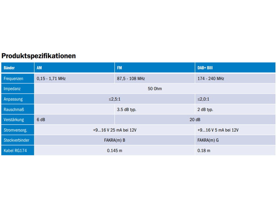- Kategorie/Besonderheit: akt. Sharkfin-Antenne mit getr. Signalführung, für VW/Audi, MB, Phantom- o. externe Speisung