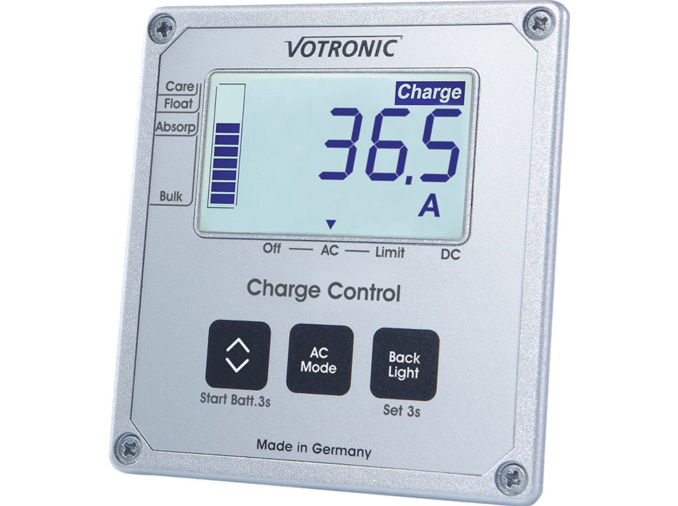 Bei Solar-Betrieb des VBCS-Triple stehen zudem die Anzeigen für die aktuelle Solarleistung (W) und für eigene Statistikzwecke die Energie-Zähler (Wh und Ah, jederzeit auf „Null“ rücksetzbar) zur Verfügung. Mittels Tastendruck wird der Netz-Lademodus des VBCS Triple manuell ein- bzw. ausgeschaltet oder leistungsmäßig reduziert (AC Power-Limit), z.B. bei zu schwach abgesichertem Landstrom. Eine spezielle Schutzfunktion sorgt dafür, dass eine versehentlich ausgeschaltete Netz-Ladung reaktiviert wird, wenn die Bordbatterie Gefahr läuft, tiefentladen zu werden.