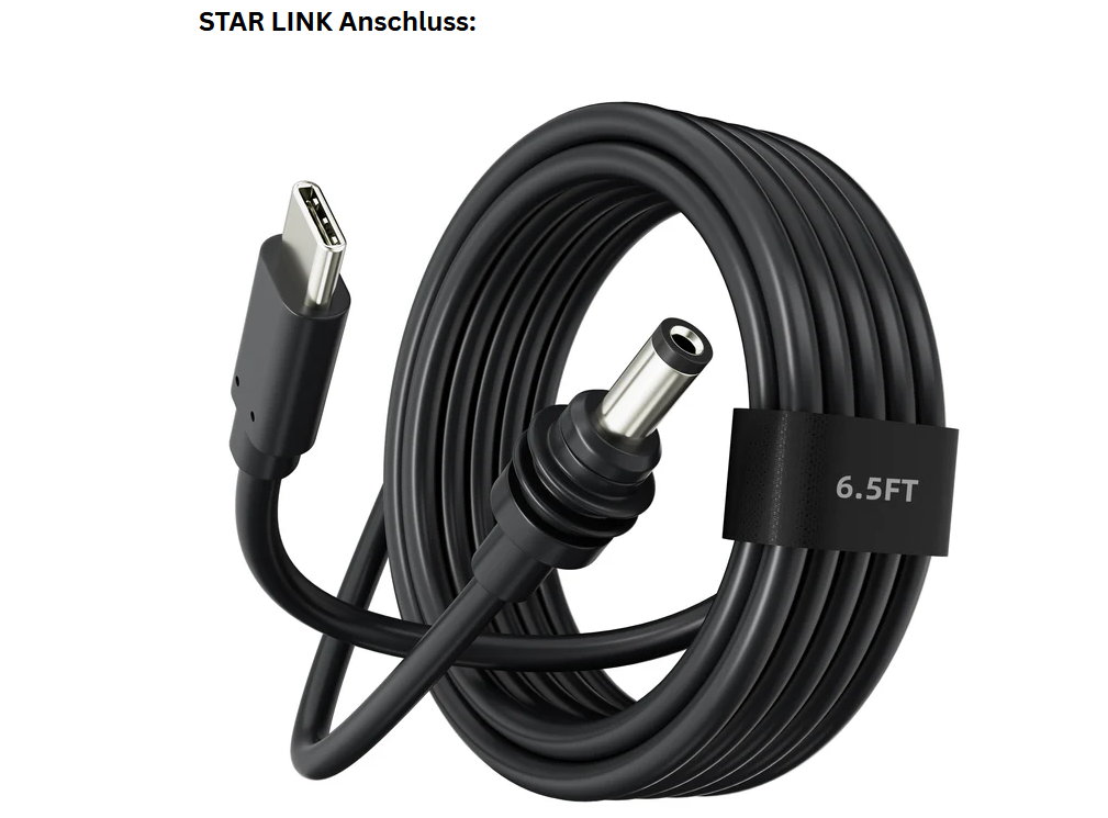 Das passende Kabel zum Betrieb des Starlink Mini ist im Lieferumfang enthalten. Es verfügt über eine Dichtung auf der DC-Seite, um das Eindringen von Wasser zu verhindern. Mit einer Länge von 2 m lässt es sich problemlos durch eine Dachdurchführung verlegen und ermöglicht so eine einfache Dachmontage. Der integrierte Chip sorgt dafür, dass das Kabel die benötigte Spannung von max. 20V bei 5A aus dem PD3.0 Netzteil liefert.