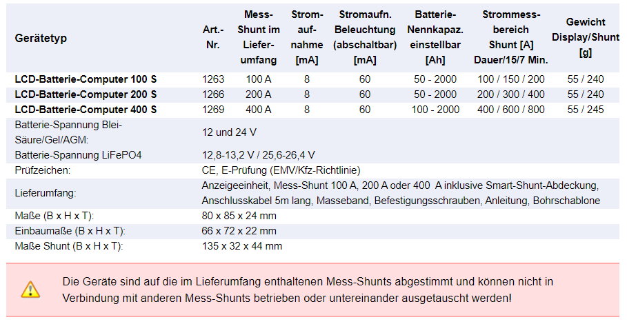 The unit is constantly in contact with "its battery" and thus registers and evaluates all battery actions. All charging and discharging currents are meticulously counted, and battery size, self-discharge, battery load, etc. are taken into account using programmed characteristic curve fields. The remaining capacity of the battery is then calculated from the measured values and the battery size. The result is the correct display of the state of charge (the capacity that can still be removed, residual charge) of the on-board battery as a numerical value in ampere hours ("Ah") and in percent ("%") as well as a clear level bar, like a fuel gauge. The LCD Battery Computer S is suitable for all battery types (acid, gel, AGM, lithium adjustable) with 12V and 24V battery voltage.