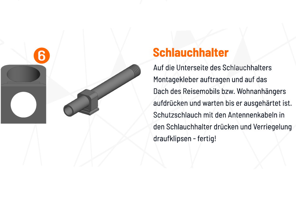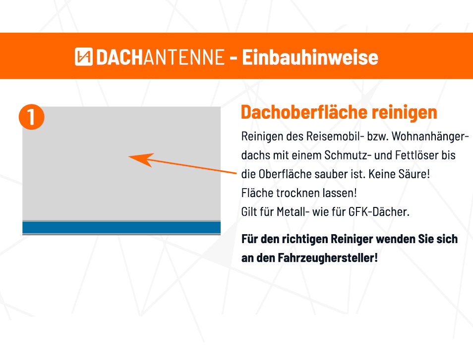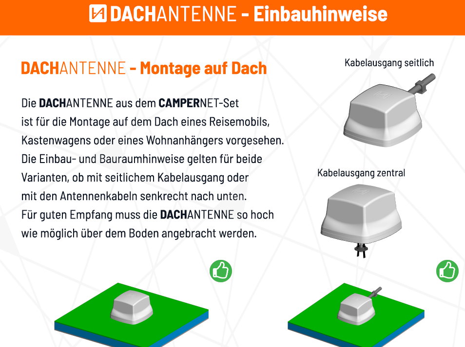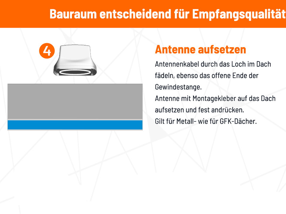 The roof antenna with central cable routing is specially designed for installation above the roof opening in the motor home. The underside of the antenna is covered with mounting adhesive and glued to the pre-drilled hole in the motorhome roof. The body-independent antenna does not have to be screwed to the roof and does not need a metal plate underneath it for good reception.