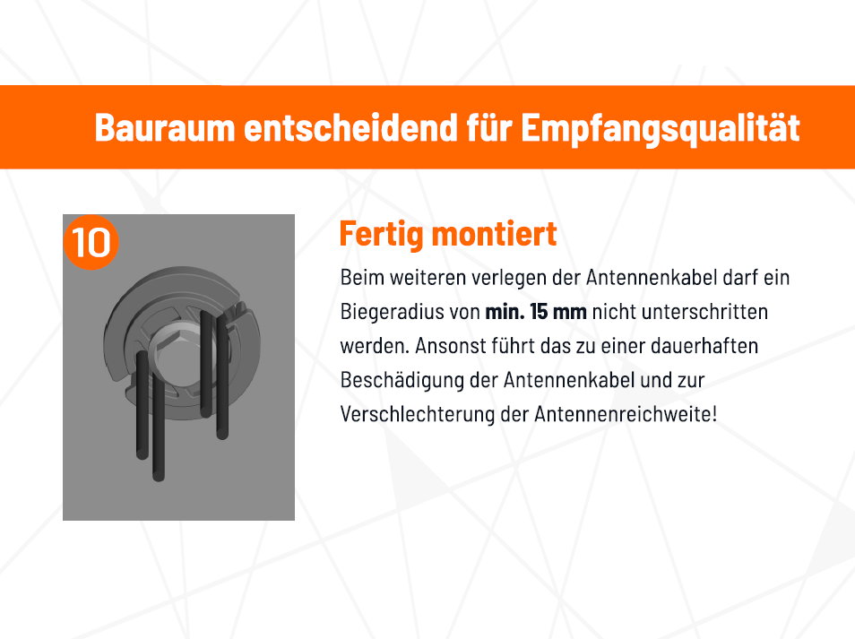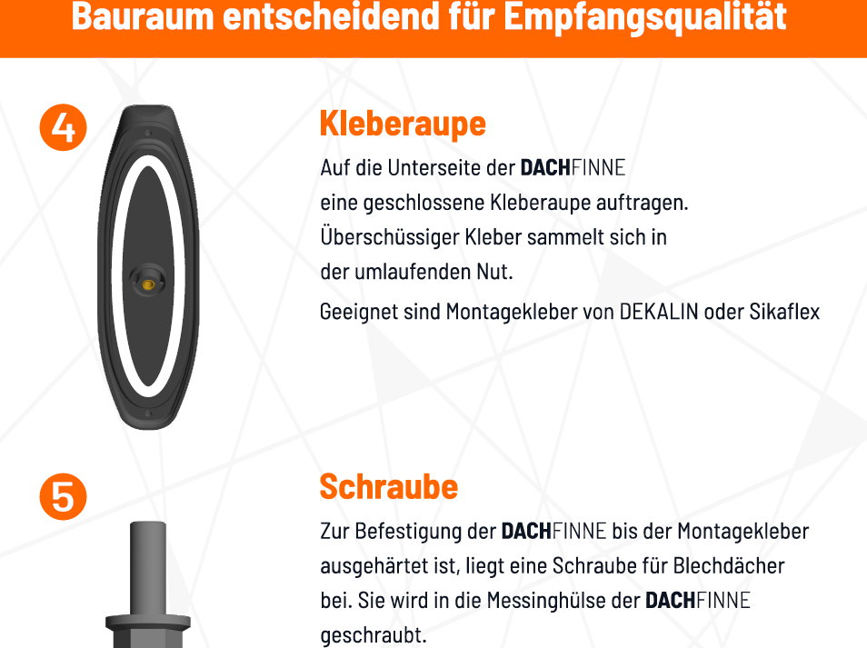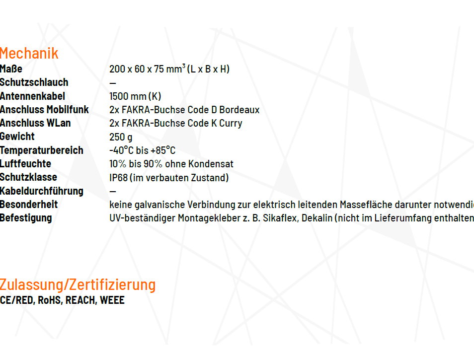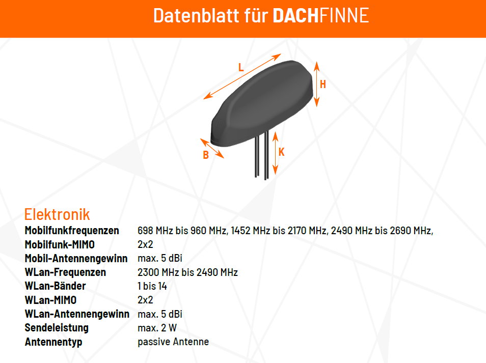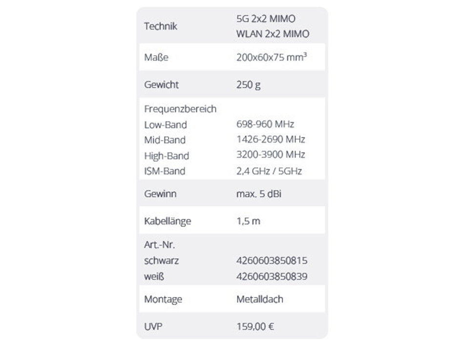 The antenna is characterised by 4 receiving elements for LTE/5G. Thus, it supports especially the fast 5G routers, which allow to use 2 modems in parallel and thus to double the transmission speed.