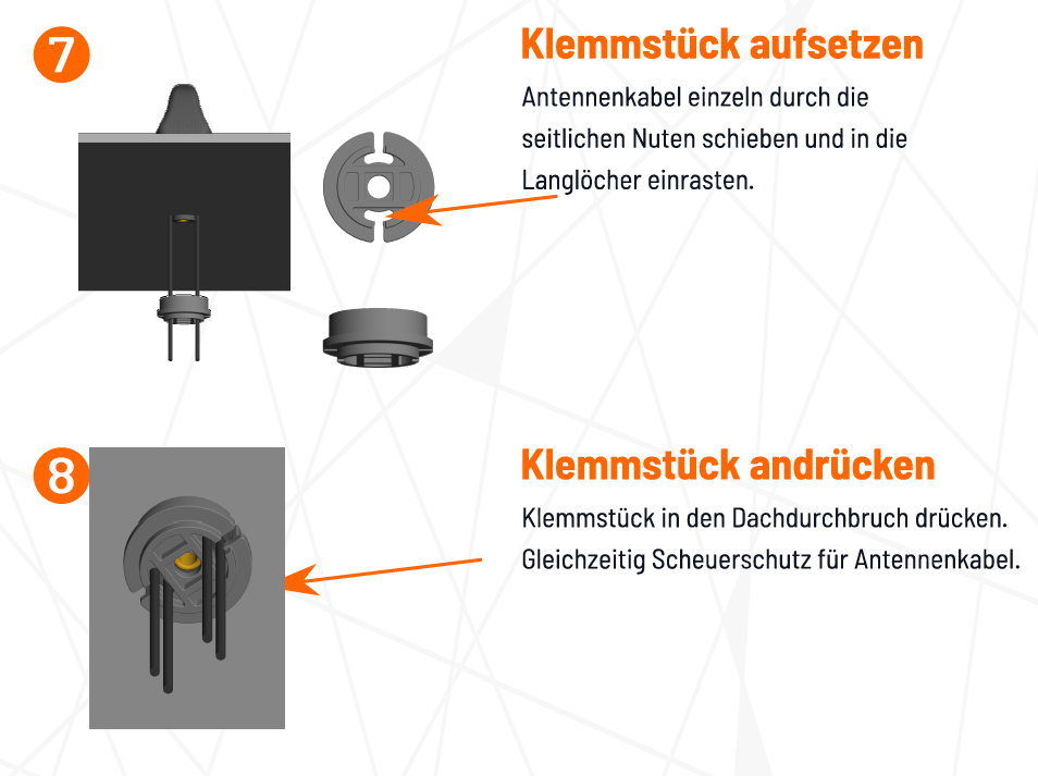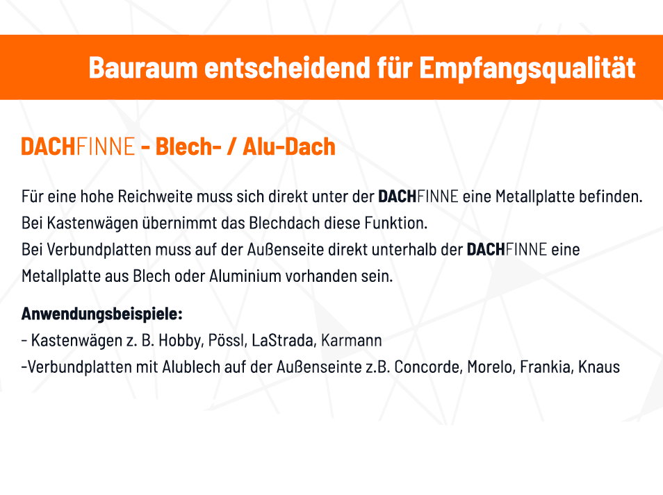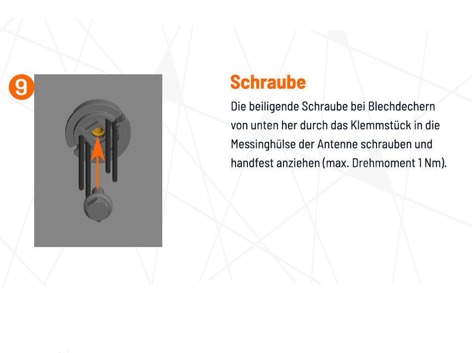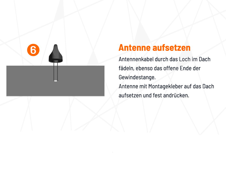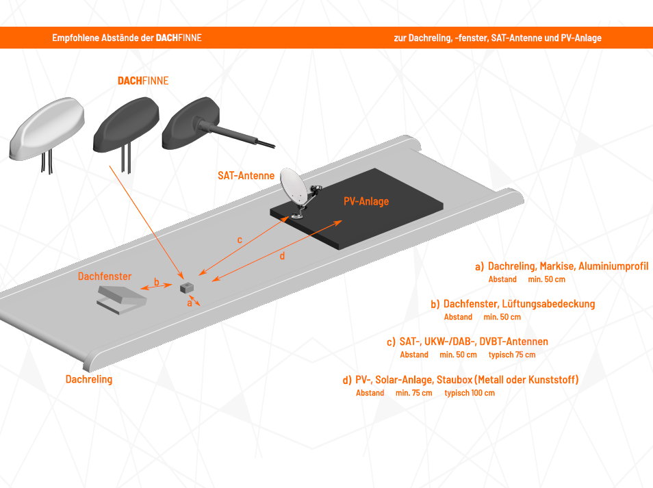 The special feature of this antenna is that the antenna has an 8th connection for combinations of FM; DAB+. With an optional radiator/amplifier/cable kit, this connection can be used for the functions mentioned. In this case, the antenna must then have a ground plane, i.e. be mounted on metal. If the roof is made of a non-conductive material, the following antenna supports can be used: 15903, 15904 or 15906. Please order separately.
