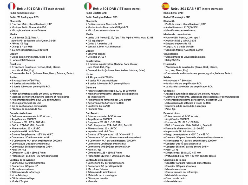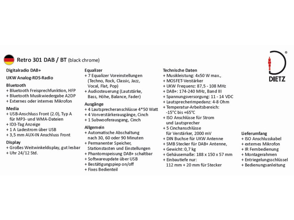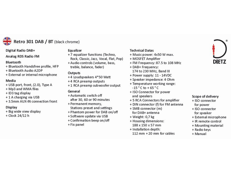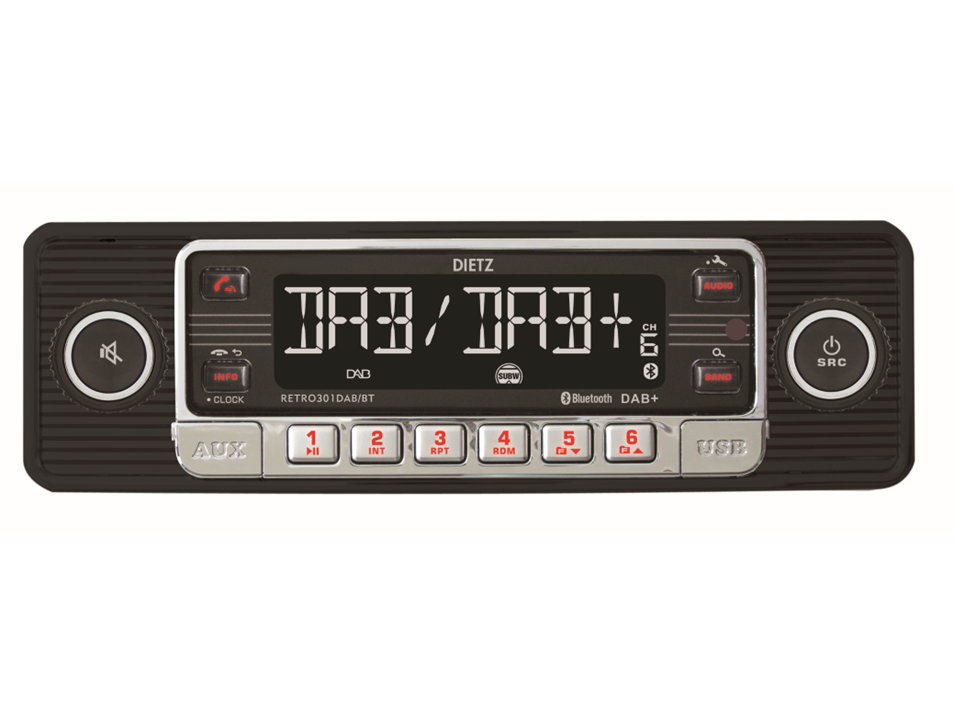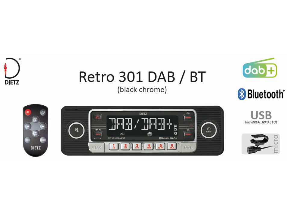 The Dietz radios Retro300DAB and Retro301DAB offer you all functions, that you can expect from a modern and high-quality car radio. This also includes features such as, for instance, preset equalizer function, 4 Loudspeaker outlets with 4 * 50 Watts, MOSFET Amplifier, 5 preamp outlets, storage of radio stations and settings, infra-red remote control and automatic switch off after 30, 60 or 90 Minutes.
