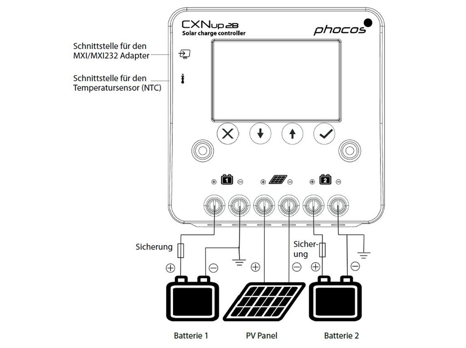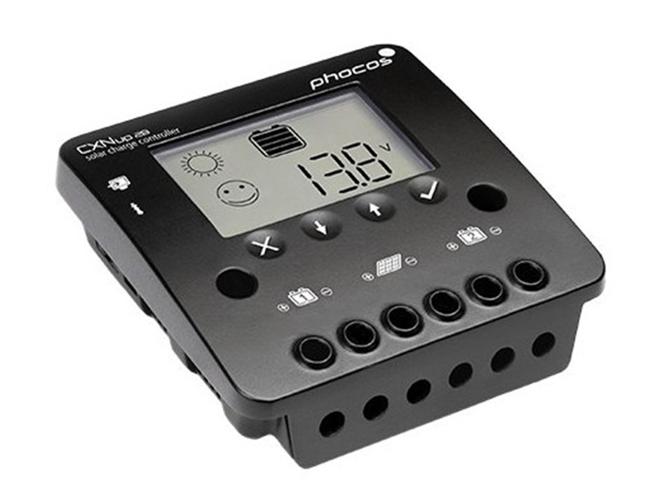 In addition to PWM charge control with temperature compensation and an LCD, the CXNup 2B controller is equipped with extensive control, programming and safety functions. The battery's state of charge is permanently displayed via a bar graph, as are the energy flows to the batteries. When installed in a camper van, the CXNup 2B keeps the starter battery fully charged and provides flexible presets for the batteries. The solar charge controller also has acoustic warning functions.